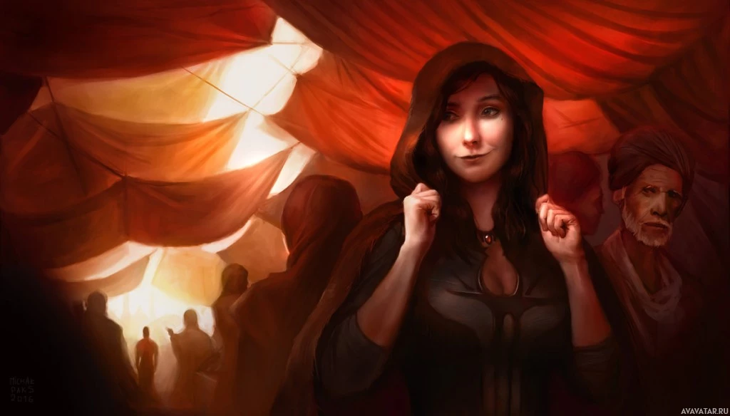 a thoughtful expression. There are other figures visible behind her; however, their faces are obscured by the hood's shadow, maintaining
