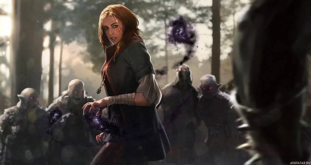 a serious expression and seems to be in a combat-ready stance. Behind her, there are multiple figures that resemble orcs, which are