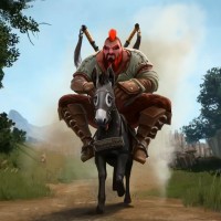 The image shows an animated character riding a donkey. The character is wearing what appears to be armor and has a red helmet with horns, suggesting that they might be from a fantasy or adventure-themed setting. The background features a rural landscape with trees and rolling hills. There's no text visible in the image.