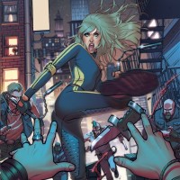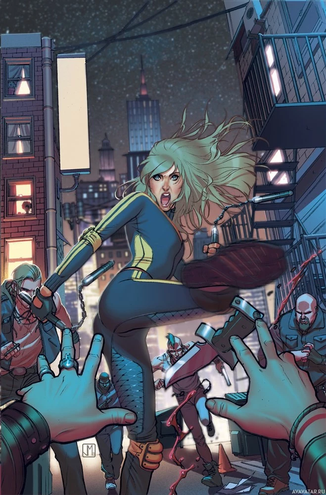a female character with blonde hair, wearing a black costume that resembles that of a superhero or vigilante. She seems to be in action or combat stance, suggesting she might be defending herself from