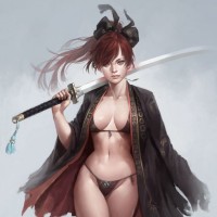 red hair styled in an updo, is wearing traditional Japanese armor with a visible breastplate, and holds a sword in her hand. The character is depicted with a confident and assertive posture, which is often associated with strength and readiness for battle in such representations of