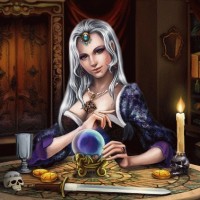 white hair, wearing what appears to be a wizard or sorcerer costume. She is seated at a table that has various items on it such as books, candles, and what looks like a wand or a tool for divination. The setting suggests a magical or mystical environment, possibly a representation of a witch's workspace or