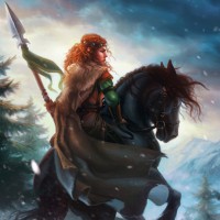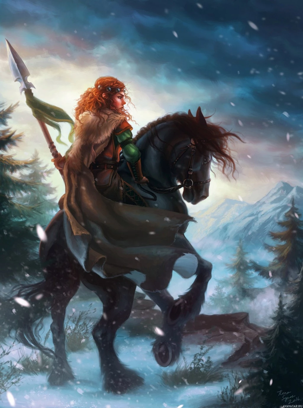 red hair, wearing what looks like traditional or fantasy-style clothing, including what seems to be a cloak and holding a lance in her right hand. She has a determined expression on her face and is set against a wintery landscape, possibly suggesting a scene from