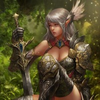 silver hair and pointed ears, which are typical characteristics of fantasy elves. She is wearing a detailed armor that includes shoulder guards, a breastplate, and gauntlets. Her attire suggests she might be a warrior or protector within the context of this