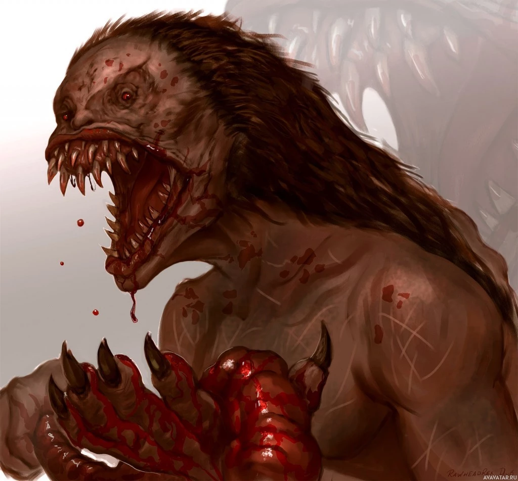 sharp teeth, giving it a ferocious appearance. The creature is covered in blood, which appears to be dripping from its mouth and claws, indicating violence or a recent attack. There are also visible scars on the creature's face and torso. This image conveys