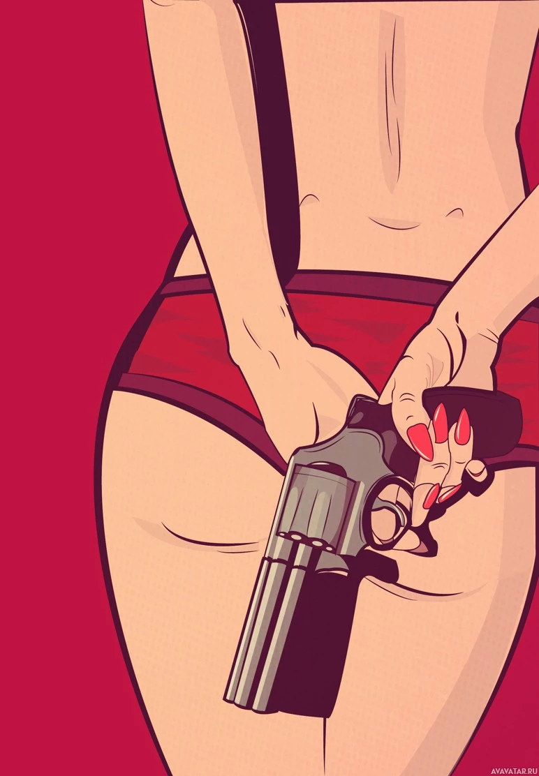red underwear and has her hand on her hip while holding what appears to be a pistol. This artwork is reminiscent of certain aesthetics found in