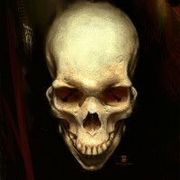 The image shows a skull with an exaggerated grin. It appears to be an illustration or artwork rather than a photograph of a real object. The background is dark and textured, which contrasts with the bright white bones of the skull, making it stand out as the central focus of the image. The overall tone of the picture seems somewhat macabre or edgy due to the grimacing expression on the skull.