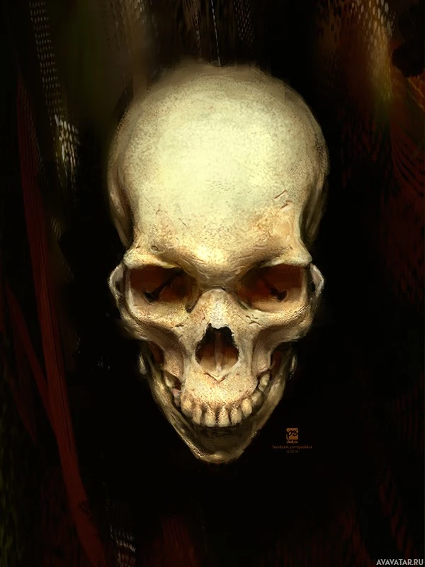 На картинке изображен череп с преувеличенной ухмылкой. Это скорее иллюстрация или произведение искусства, чем фотография реального объекта. Фон темный и текстурированный, что контрастирует с яркими белыми костями черепа, что делает его выделяющимся в качестве центрального фокуса изображения. Общий тон картины кажется несколько жутким или резким из-за гримасы на черепе.