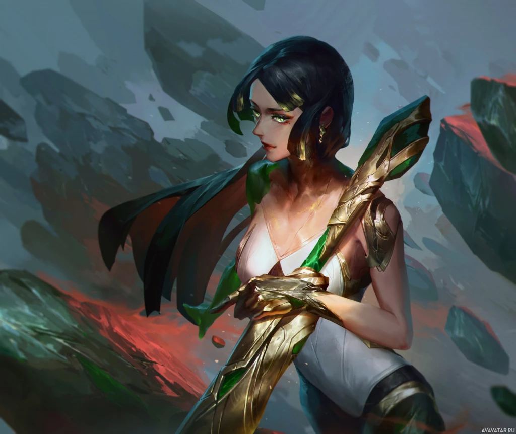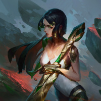 dark hair and is wearing armor with elements that suggest she might be from a high-fantasy or mythical background. In her hand, she holds what appears to be