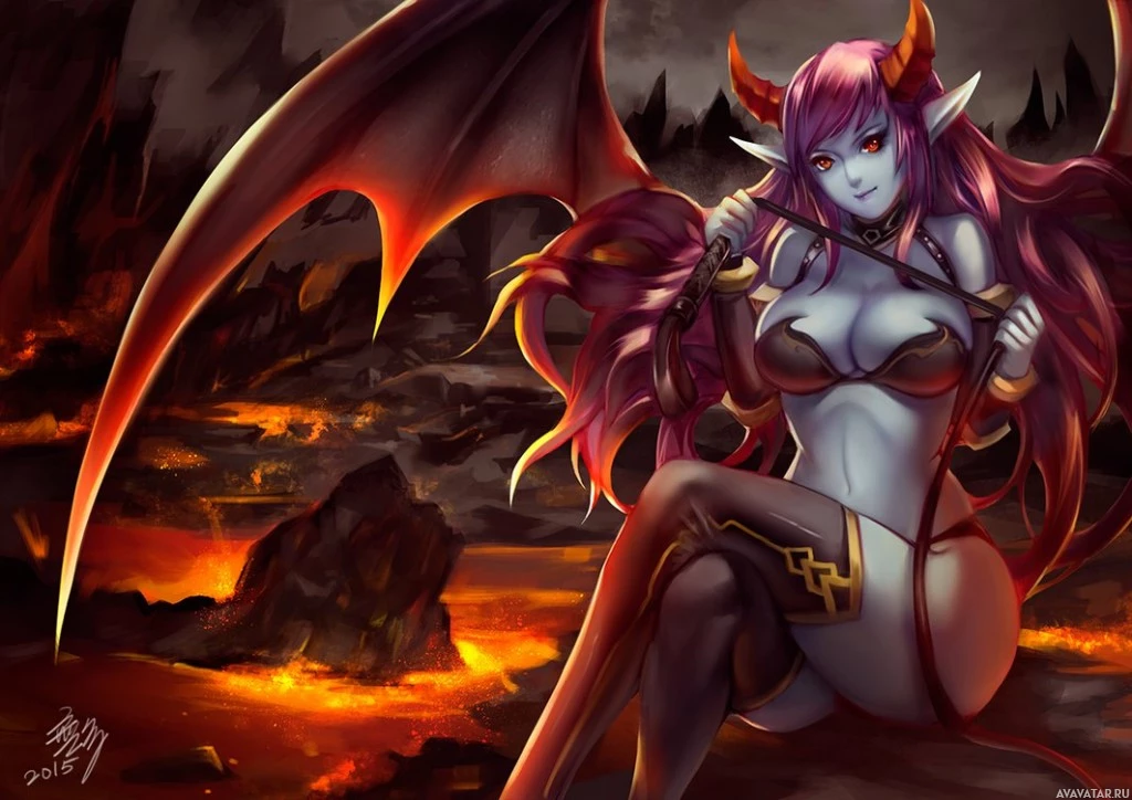 a fantasy character that is commonly referred to as a succubus. The character has red hair, pointed ears, and horns on her head, which are typical features associated with succubi in mythology and