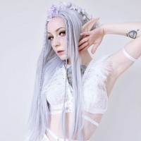 a white outfit with feathers around it. Additionally, they have visible tattoos on their arms and appear to be posing for the photograph. The individual is styled in a way that suggests they might be participating in or representing the fantasy theme, possibly for