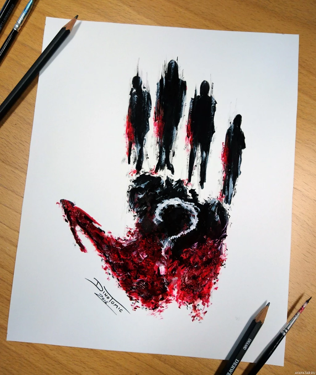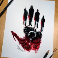 The image shows a piece of artwork featuring what appears to be a handprint or footprint with the silhouettes of