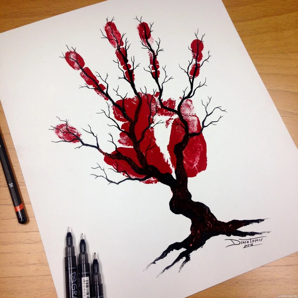 Elder Scrolls," which might be an error or simply a reference to the genre of fantasy games that often involve hand gestures for gameplay. The artwork is visually striking and incorporates red elements, possibly representing blood or some other form of vitality within the tree-like structure.