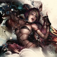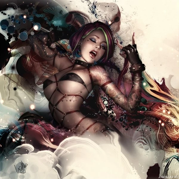 colorful hair and striking makeup that includes eye-catching patterns on her face. The character is adorned with intricate tattoos and appears to be wearing a corset or bustier with a garment over it, which is part of
