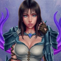 blue eyes, and is wearing armor with a purple color scheme. There's also some kind of magical or mystical
