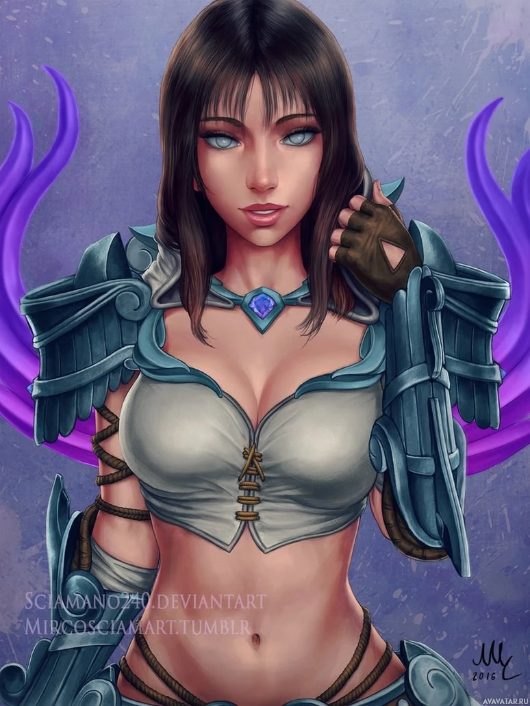 a female warrior. She has long brown hair,