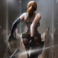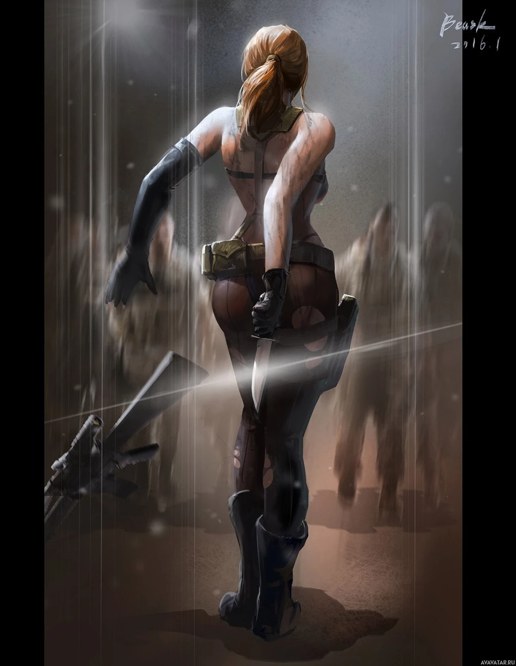the video game "Metal Gear Solid V: The Phantom Pain." This character is known as Quiet, and she is shown from behind. She appears to be wearing a tactical outfit with various equipment, such as what seems to be