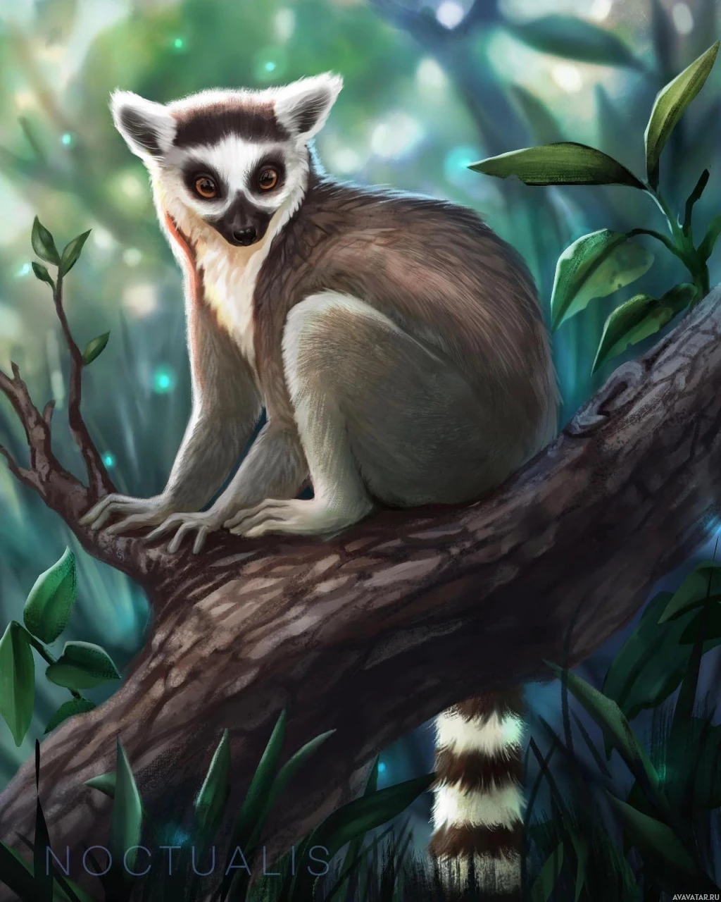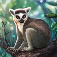 The image features an animal that closely resembles a lemur. It is depicted sitting on a branch in what appears to be a lush, jungle-like environment with