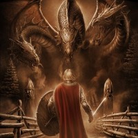 dark clouds and what appears to be a ruined landscape or battlefield. The warrior is armed with a shield and a sword, suggesting a confrontation with the dragons. This image could be associated with themes of fantasy, epic battles, or