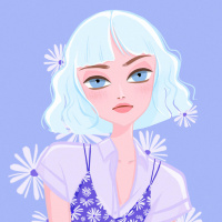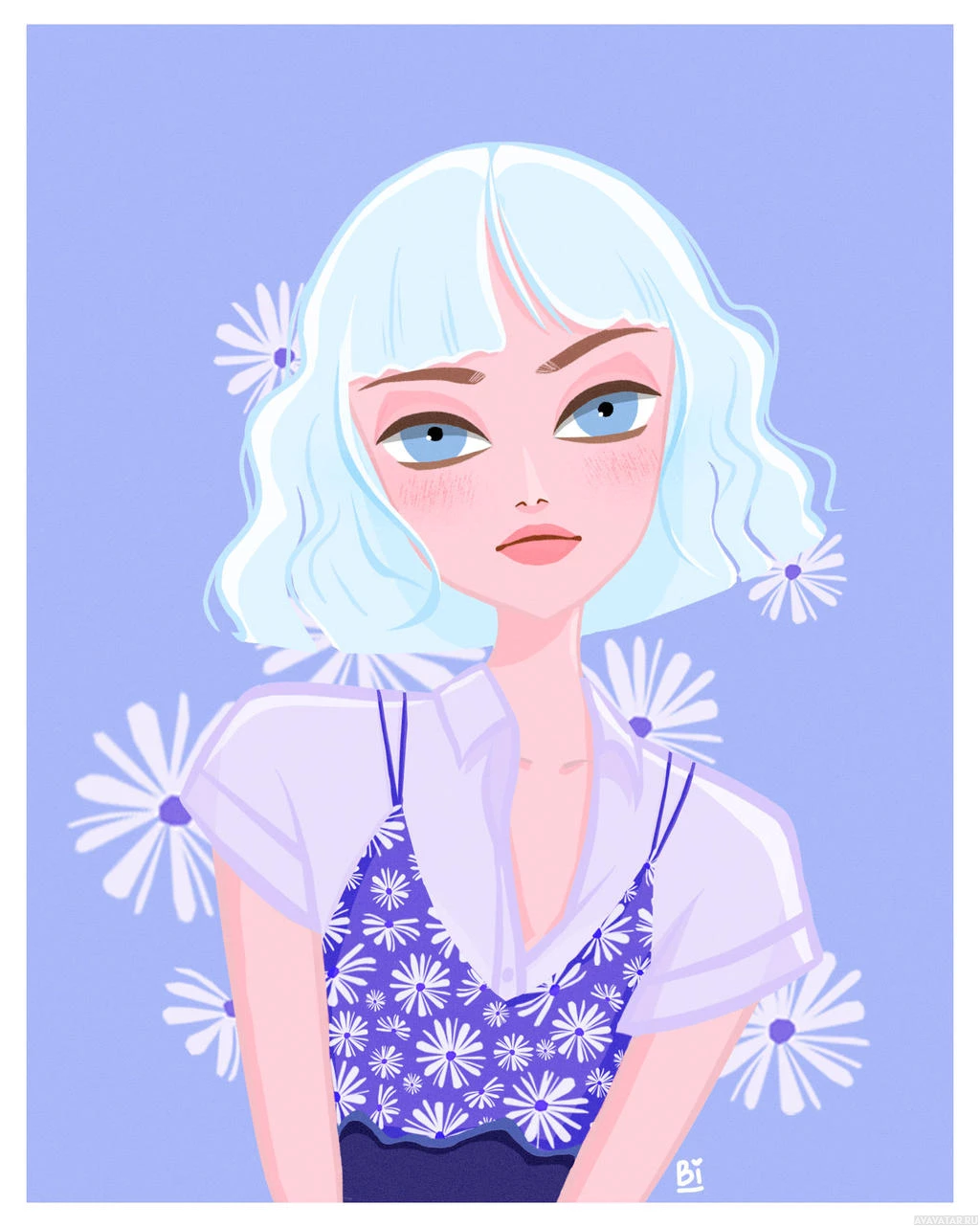 blue hair, wearing a purple top with white polka dots. She is sitting against a background that includes daisies, which are purple and white in color. The overall style of the artwork leans towards a whimsical or cartoon-like appearance, characterized by exaggerated features such as