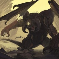 a menacing expression on his face, surrounded by a fiery aura. He has two wings, one on each shoulder, which suggests he may have some sort of avian or dragon-like nature in