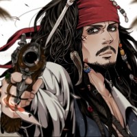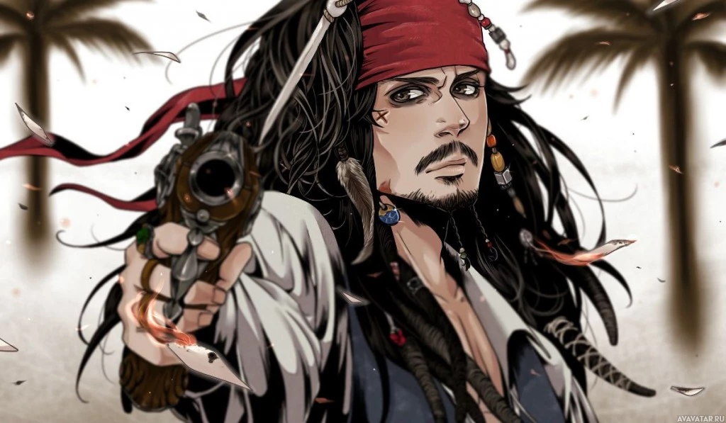 The image features a stylized representation of Jack Sparrow, a character from the "One Piece" series. He is depicted with his iconic hat, sunglasses, and flintlock pistol, embodying the adventurous spirit of pirate lore.