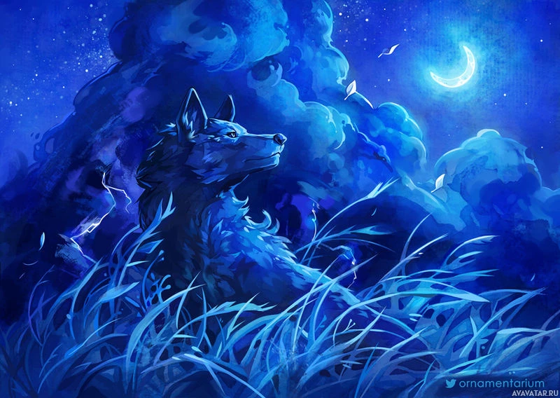 tall grass. The background has elements such as a crescent moon and clouds that give the impression of