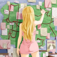 blonde hair, wearing pink or salmon-colored lingerie. She is standing with her back to the camera and one hand on her hip while pointing at a map that is covered in various