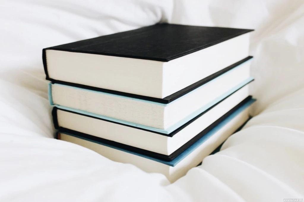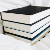 a stack of books on a bed. The top book has its spine facing the camera, revealing blue and white stripes across the binding. This pattern is characteristic of the '