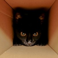a black cat inside a cardboard box. The cat is looking out from the opening of the box, and it appears to be resting or hiding within the confines of the box. The image has a focus on the cat, with the background being less distinct due to the contrast between the light