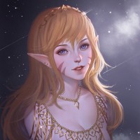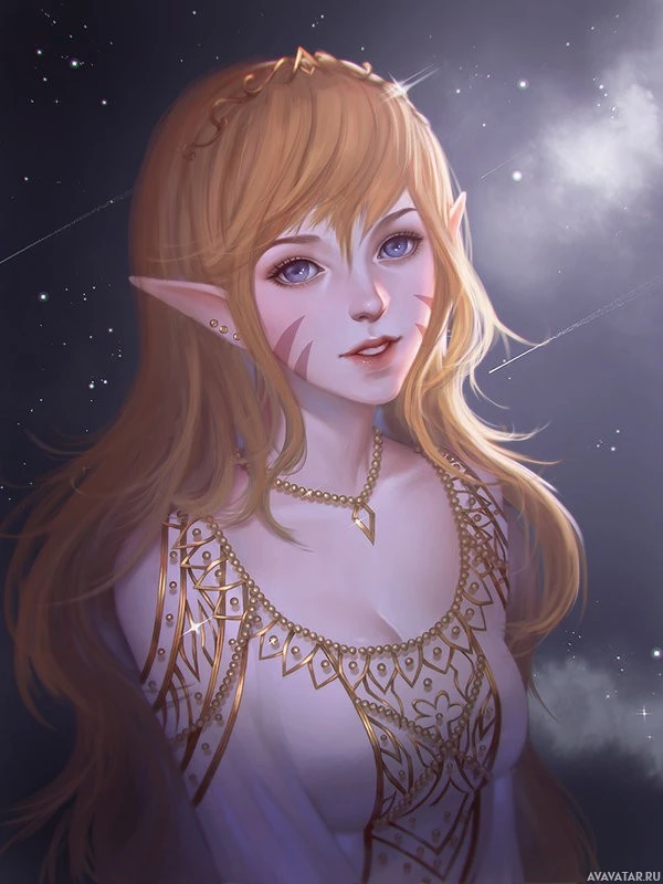 The image shows a character depicted as an elf with fantasy elements. She has long