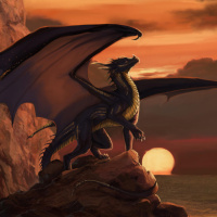 The image depicts a fantastical scene with a dragon, which is typically associated with the genre of fantasy. The dragon appears to be standing on rocky terrain, possibly at sunrise or sunset given the warm glow in the sky and the silhouette of the landscape. The setting looks like it could be from a story or mythical world, often found in fantasy literature or artwork.