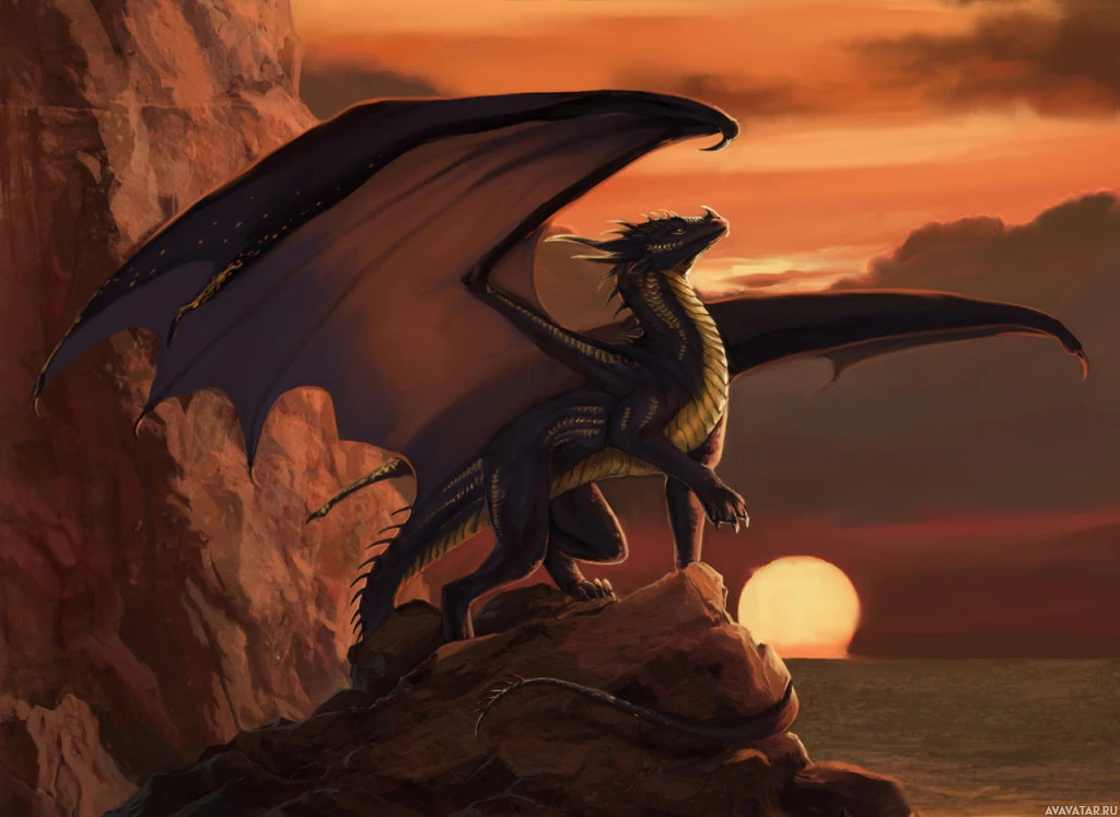 На картинке изображена фантастическая сцена с драконом, которая обычно ассоциируется с жанром фэнтези. Дракон, кажется, стоит на скалистой местности, возможно, на рассвете или закате, учитывая теплое свечение в небе и силуэт пейзажа. Сцена выглядит так, как будто это может быть история или мифический мир, часто встречающийся в фэнтезийной литературе или произведениях искусства.