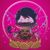 dark hair, is wearing some sort of outfit with what looks like armor or a costume, and is sitting down. The background is plain and does not provide additional context. The image is stylized with red and purple hues, emphasizing