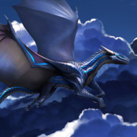 The image features a majestic dragon flying through a cloudy sky. It has blue and black scales, with a long tail that adds to its graceful flight. The art style suggests it could be from a fantasy-themed game or book illustration.