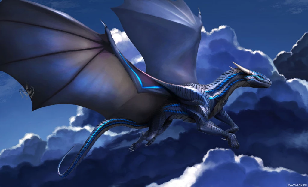На картинке изображен величественный дракон, летящий по облачному небу. Он имеет синие и черные чешуйки, с длинным хвостом, который добавляет ему изящный полет. Художественный стиль предполагает, что он может быть из фэнтезийной игры или книжной иллюстрации.