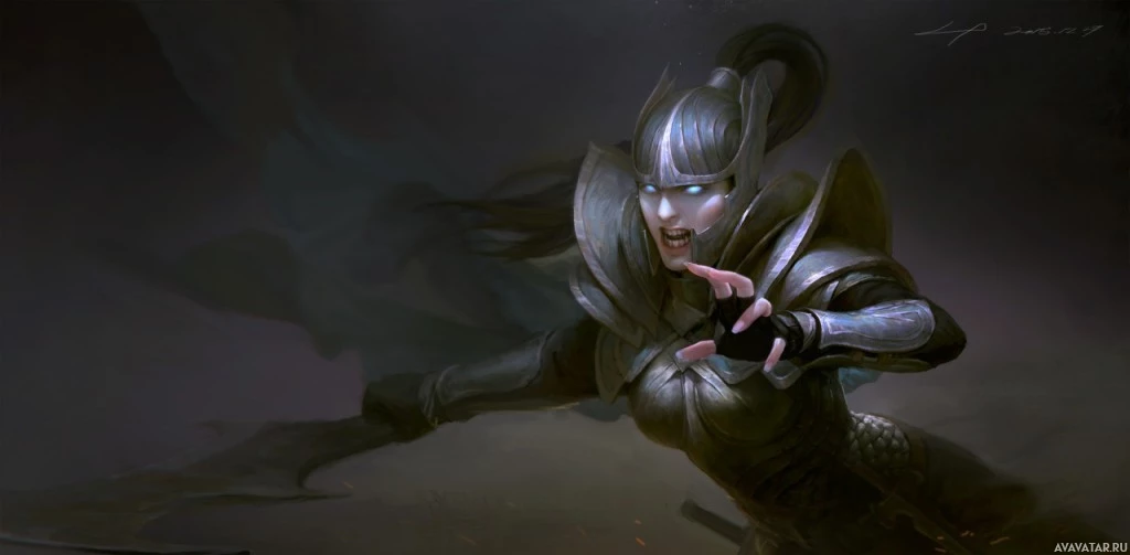 Phantom Assassin, who is recognized by her ghostly appearance and the signature pose of holding two blades crossed in front of her. The artwork captures the character with