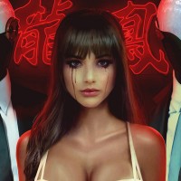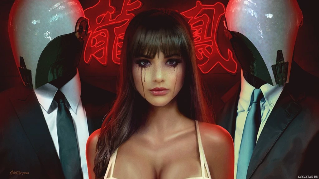 a video game, given their stylized appearance and clothing that resembles in-game attire. On either side of the central figure are characters wearing masks, which is reminiscent of characters known as "Ghosts" from the game "Among Us." The background has an otherworldly or neon aesthetic with Chinese-style lettering that adds to