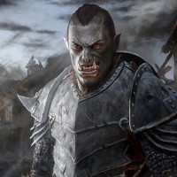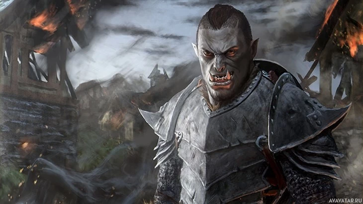 a fantasy character that appears to be an orc, which is a type of creature commonly found in various works of fantasy fiction, including video games and literature. The character is shown standing amidst destruction, with dark,
