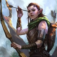 На картинке изображен фэнтезийный эльфийский персонаж. Она имеет рыжие волосы и держит лук в левой руке, предполагая, что она может быть опытным лучником или охотником. Фон кажется зачарованным лесом с туманным воздухом, способствующим мистической атмосфере сцены.