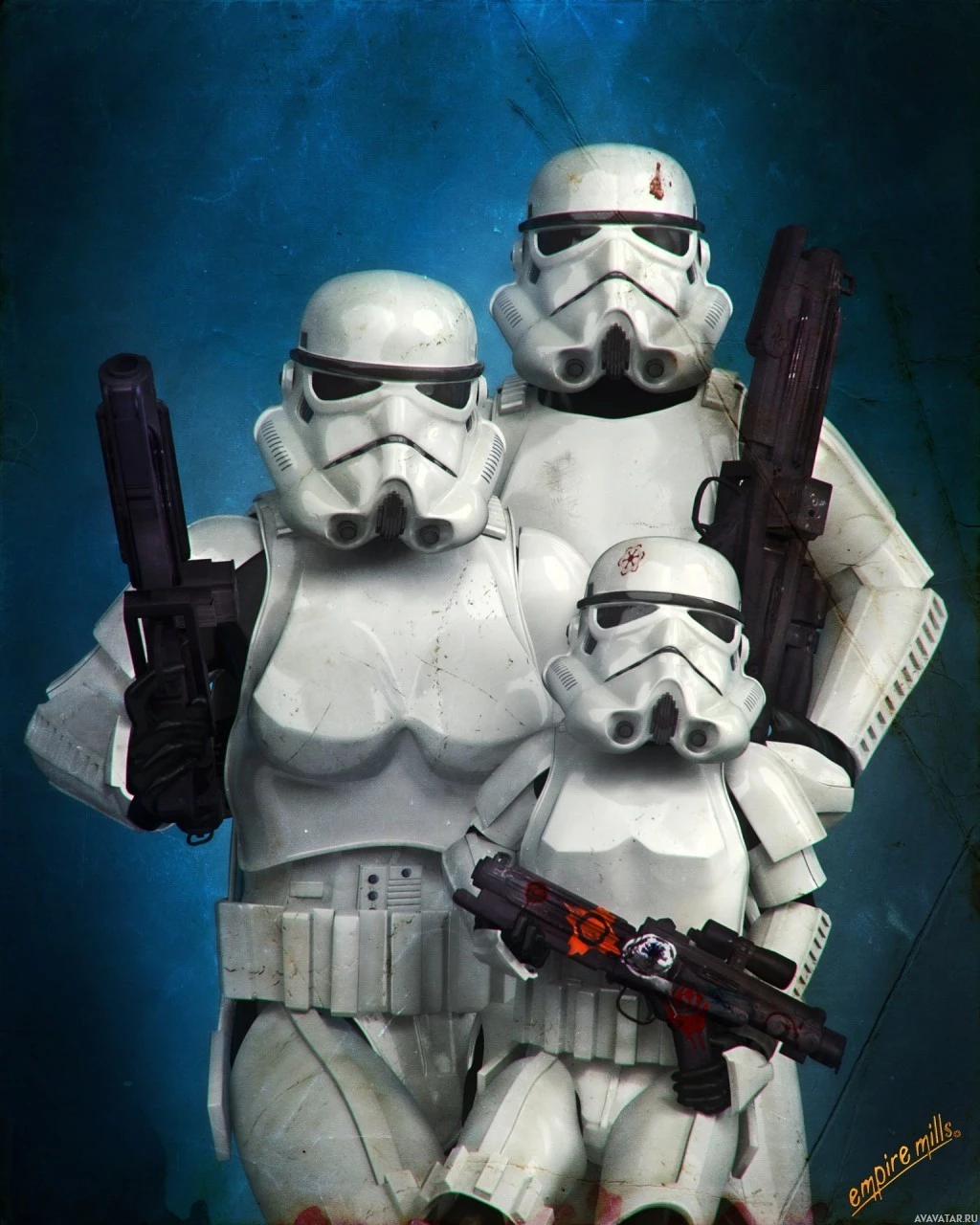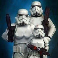 a young character. They all have blaster rifles attached to their backs and appear to be posed as if they are part of a family or unit with