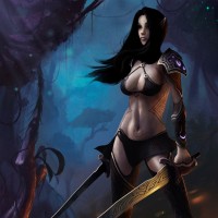 common traits in fantasy artwork for elves. She is holding two swords crossed in front of her body, suggesting she might be a warrior or protector. The background gives off a dark,