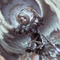 The image depicts an illustrated character that appears to be a fantasy-themed angel. The character is shown with wings, which are typical for angels in fantasy and mythology. They are holding what looks like a sword or staff, suggesting a protective or warrior role within their narrative. The background has a dark and moody atmosphere, enhancing the dramatic effect of the image.