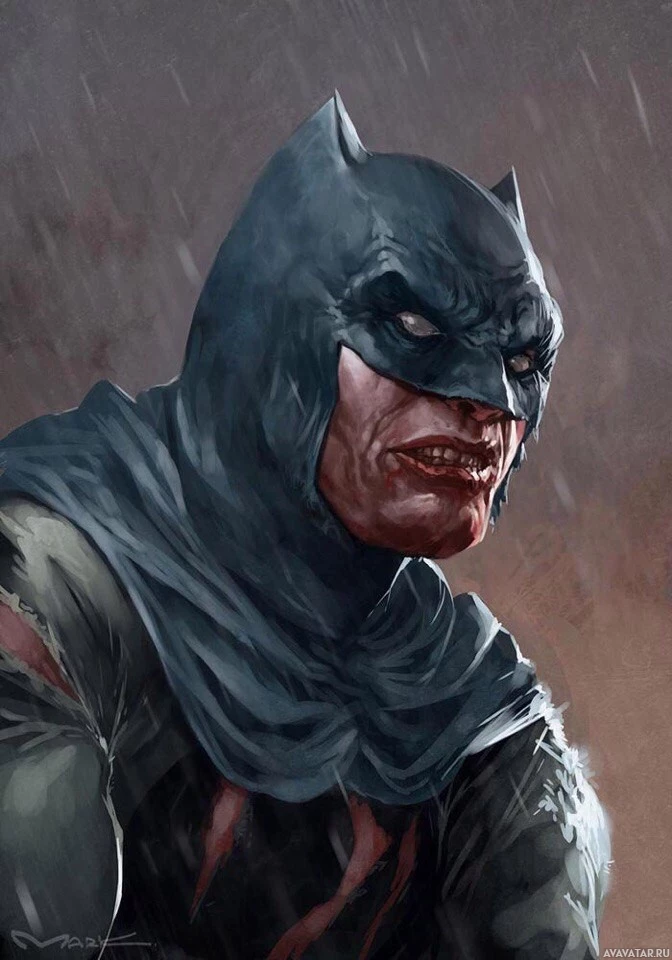 Изображение, которым вы поделились, содержит иллюстрацию Бэтмена. Он изображен в темной, угрюмой обстановке с атмосферным освещением, которое усиливает его задумчивое выражение и интенсивность сцены.