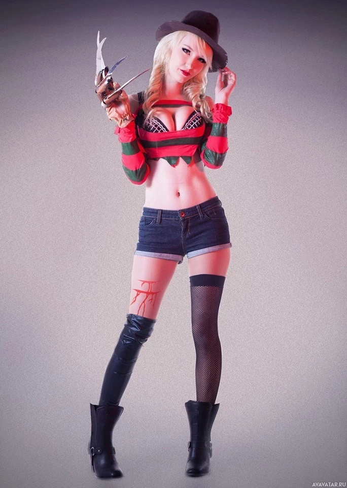 Freddy Krueger from the "Nightmare on Elm Street" horror movie series. She is wearing