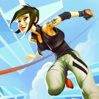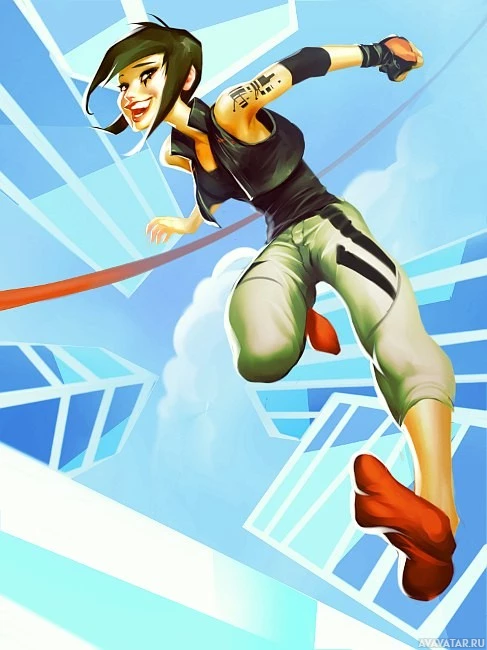 an animated character who appears to be from the game "Mirror's Edge". The character is depicted in mid-air, running at
