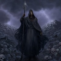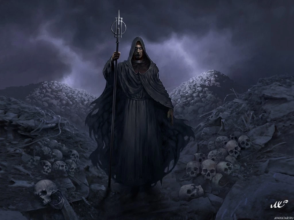 mythical character. This character is dressed in robes and has a hood, which suggests they may be associated with mystery or the supernatural. They are holding what seems to be a staff, adding to their mystical or magical appearance. The background of the image features dark, ominous clouds and