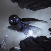 a fantasy scene with an owl-like creature perched on what appears to be the edge of a floating platform or a piece of debris. This creature has glowing eyes and is surrounded by a moody, atmospheric environment that could be from