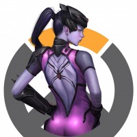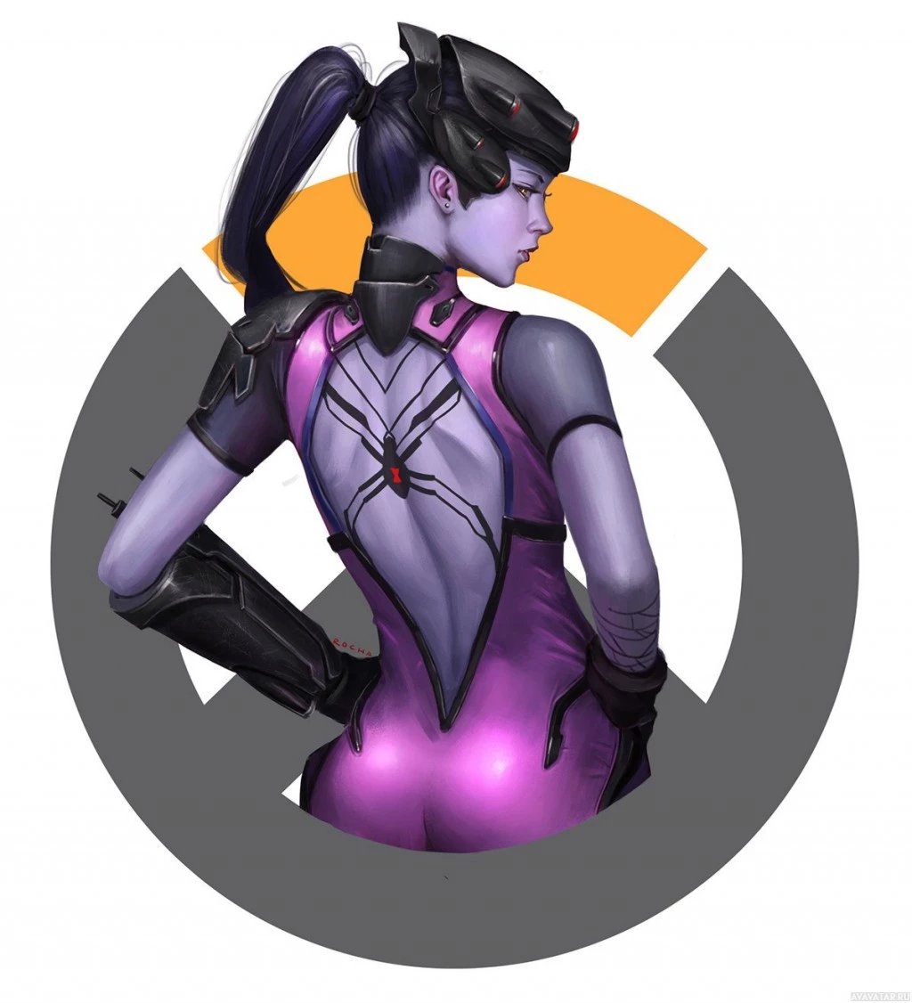a female character from the video game "Overwatch." She is depicted in an artistic style, wearing her iconic purple and