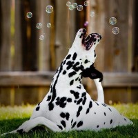soap bubbles floating in the air, adding a playful element to the scene. The dog appears alert and excited, which is typical of dogs when they feel happy or want to play.